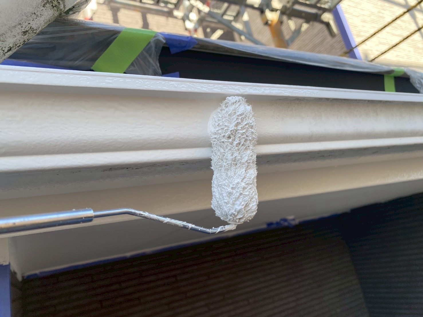 破風・鼻隠し・軒天・雨樋・水切り・配管などを再塗装。ホワイト基調で軽さを保ちつつ、アクセント部と調和。